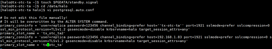 primary_conninfo = 'user=replica password=123456 channel_binding=prefer host=node2 port=1921 sslmode=prefer sslcompression=0 ssl_min_protocol_version=TLSv1.2 gssencmode=disable krbsrvname=halo target_session_attrs=any'